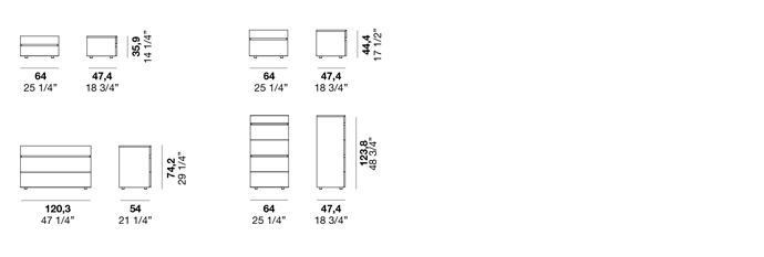 Ces modules nuit sont disponibles en deux versions de chevet, deux commodes et un semainier.